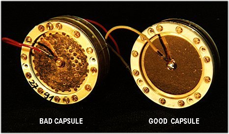 Here is a photo how a capsule looks after a fatal cleaning effort:- Hum Problems: There are 5 Siemens electrolytic caps in the power supply. Over the years it is very likely, that they have dried out and have lost capacitance. I discovered a source for this original type, so if you want to replace the caps in your PSU with the originals, I can provide them.
